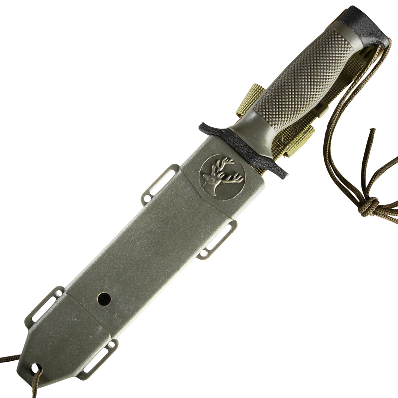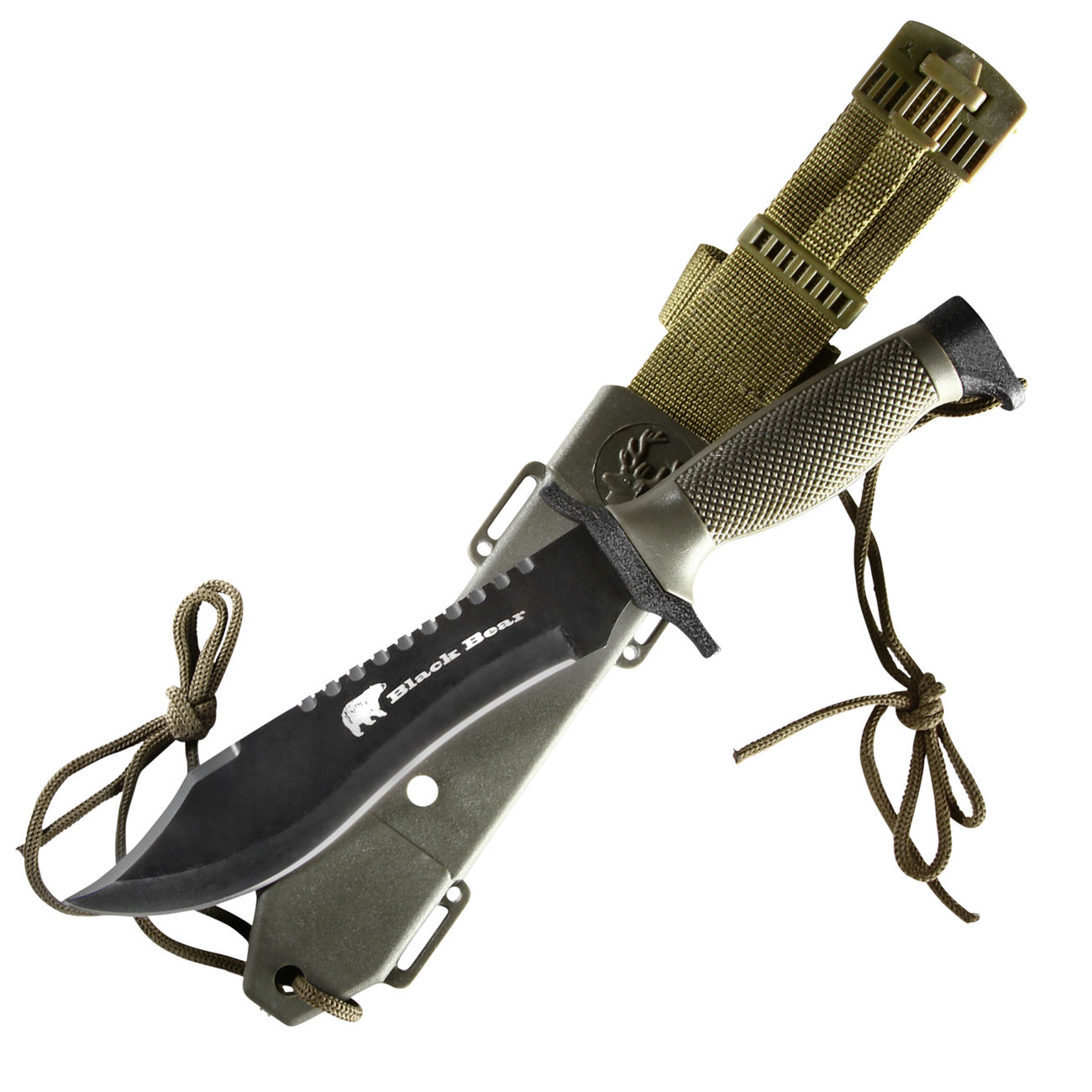 Jagd- und Outdoormesser Black Bear mit durchgehender Klinge aus schwarz beschichtetem 440er Stahl und Sägezahnung auf dem Klingenrücken. Griffiger Kunststoffgriff mit Fangriemenöse. Mit einer Gesamtlänge von ca. 30,5 cm ist das Messer sehr massiv und robust. Lieferung inkl. wasserfester Kunststoff-Gürtelscheide.