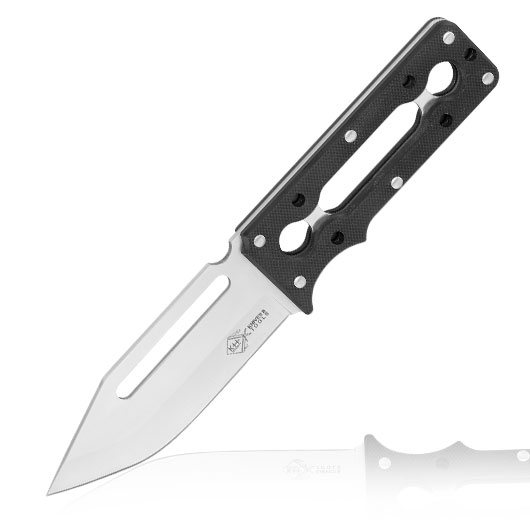 Die aufgeschraubten Griffstücke aus strukturiertem und rutschfestem Kunststoff bieten auch bei Nässe sicheren Halt. Tiefe Fingermulden und die ergonomische Form sorgen für optimale Kontrolle beim führen. Die Aussparungen in der stabilen Fulltang-Konstruktion verleihen eine moderne Optik und eignen sich zum umwickeln mit Fallschirmleinen.