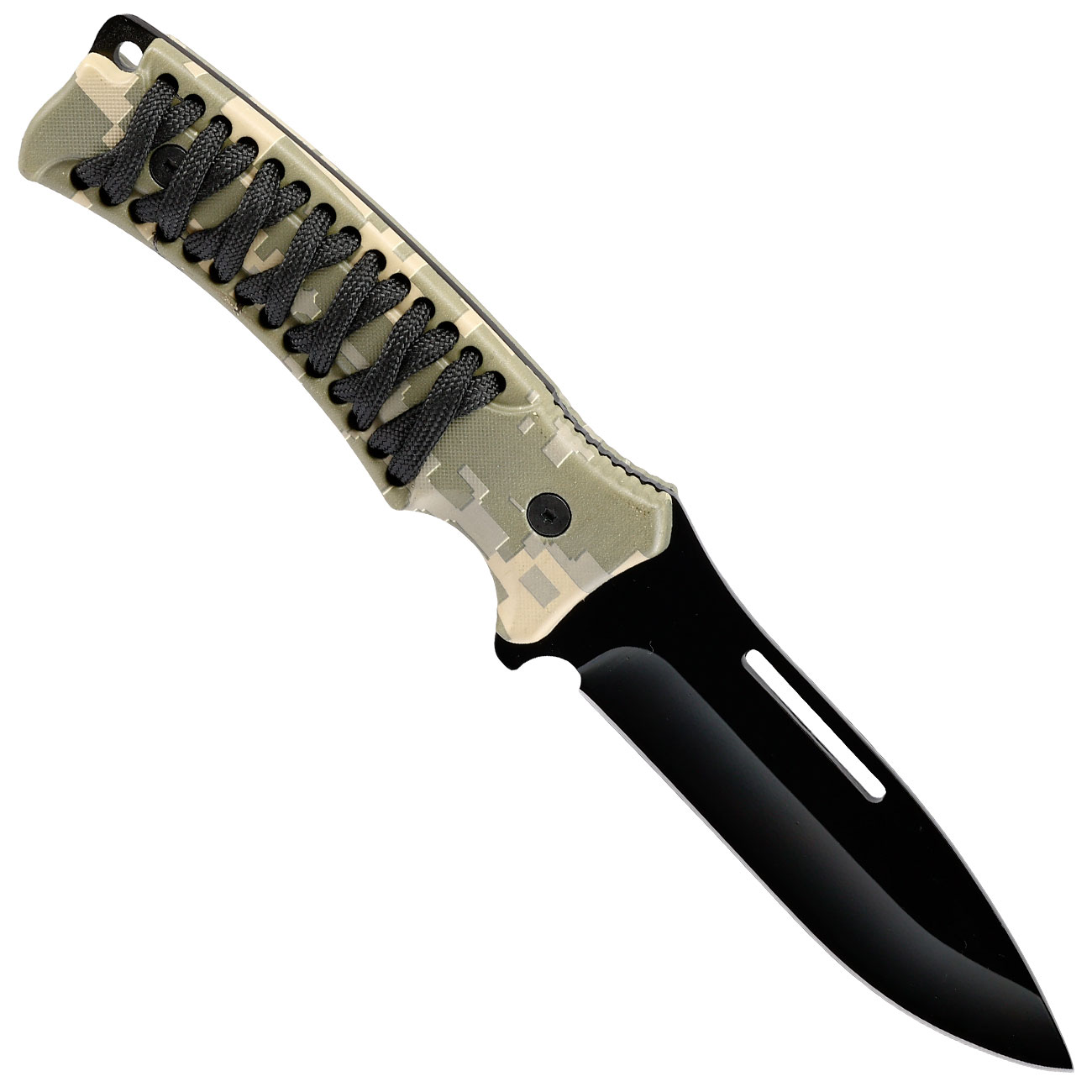 Das Outdoormesser Sports kommt in einer robusten Fulltang-Bauweise mit umwickeltem Griffstück und Nylonscheide. Die schwarz beschichtete Klinge mit Hohlkehle und Aussparung besteht aus rostfreiem 3Cr13MoV Stahl. Die sehr stabile Konstruktion macht dieses Messer ideal für anspruchsvollere Schneidearbeiten.