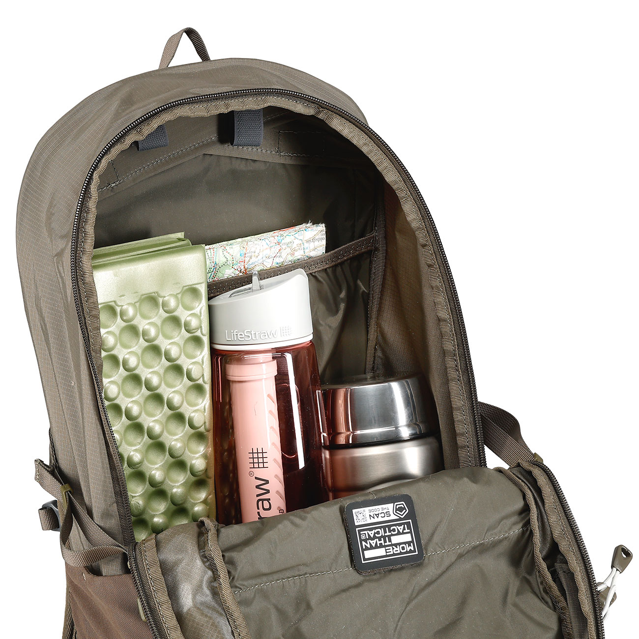 Das große Hauptfach mit zwei Reißverschlüssen ist im Inneren mit Klettschlaufen, einer Klettfläche und einem Einschubfach am Rücken ausgestattet. In der Fronttasche befinden sich Einschubfächer als Organizer und ein Netzfach mit Reißverschluss für Schlüssel, Smartphones oder andere kleine Ausrüstungsgegenstände. Die Fronttasche wird durch ein tiefes Fach mit Reißverschluss und drei Befestigungsschlaufen ergänzt. An den Seiten befinden Einschubfächer für Getränkeflaschen und Kompressionsriemen zum Fixieren des Inhalts.