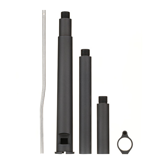 Das Außenlauf und Gas-Block Set im WCRS-Design von RA-Tech ist passgenau im CNC-Herstellungsverfahren aus stabilem Aluminium gefertigt. Der mehrteilige Lauf kann in der 12.5 Zoll oder 14.7 Zoll Konfiguration am Gewehr montiert werden. Dank der besonders passgenauen Konstruktion, besitzt der Außenlauf die gleiche Stabilität wie ein einteiliger Außenlauf. Sehr schön ist auch das matt-schwarze Finish, welches von RA-Tech im hochwertigen Eloxierverfahren angebracht wird. Natürlich darf auch ein Deko-Gasgestänge nicht fehlen, damit die Konstruktion von außen wie bei einem scharfen Gewehr aussieht.