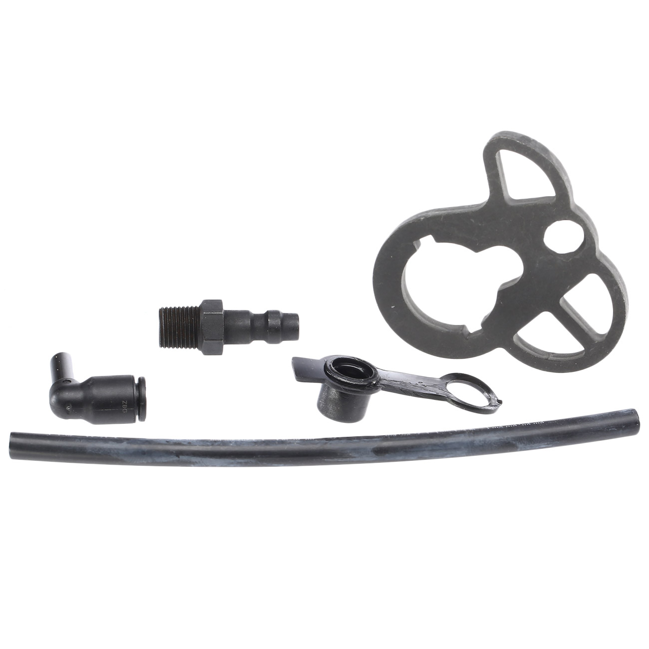 Im Lieferumfang ist eine speziell aus robustem Stahl angefertigte Ambi-Riemenadapterplate enthalten. Diese ist mit einer mittigen Bohrung im 20 Grad Winkel versehen, welche bereits über ein passendes Gewinde verfügt, um den ebenfalls enthaltenen QD-Druckanschluss einschrauben zu können. Der Anschluss verfügt über einen internen O-Ring, der ähnlich wie beim Grip Connect System auf dem Schlauch abdichtet. Weiterhin ist auch noch ein 90 Grad Anschluss enthalten, falls das Kit mit einer Polar Star Fusion Engine betrieben wird.