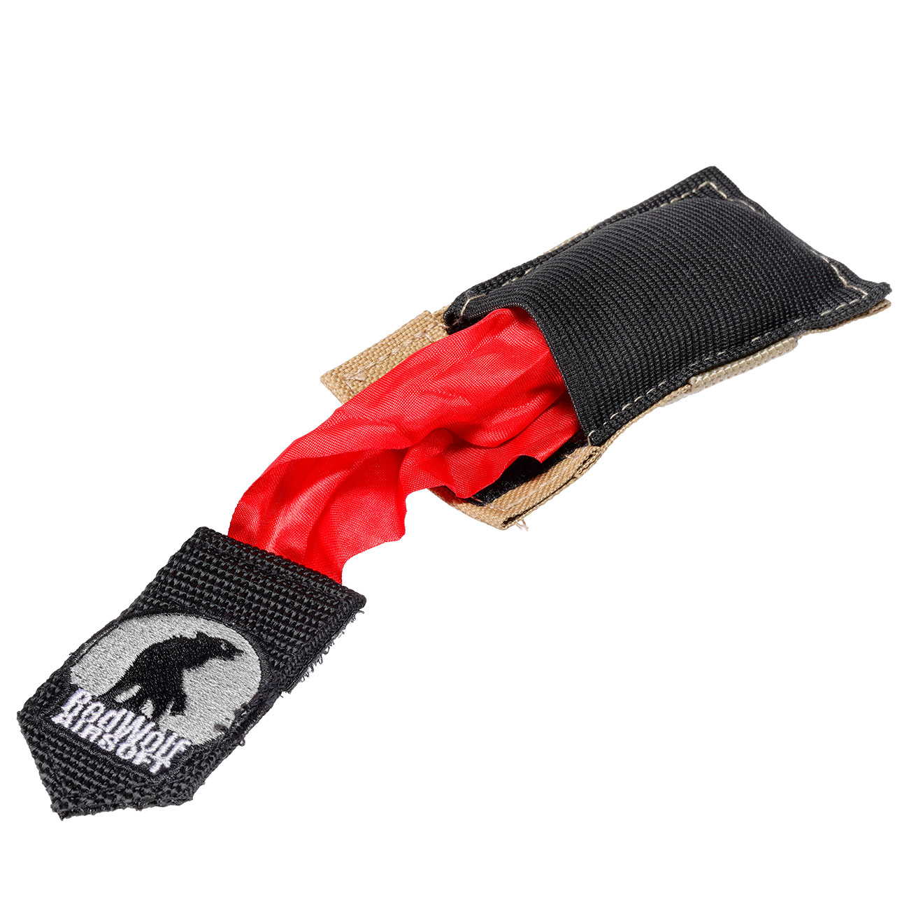 Wichtig ist aber vor allem der Inhalt der Tasche: Hier wurde von Redwolf Airsoft ein rotes Tuch eingenäht, welches durch den vorne angebrachten Klett-Patch mit RWA Logo, schnell und einfach herausgezogen werden kann. So erfolgt bei einem Treffer, durch einfaches Ziehen des Patches, die nötige rote Markierung in Form des eingenähten auffälligen Tuches. Sämtliche Mitspieler wissen dadurch Bescheid, dass man getroffen ist. Später, in der sogenannten "Safe Zone" kann dann das Tuch einfach wieder in die Tasche gestopft werden und ist bereit für den nächsten Einsatz.