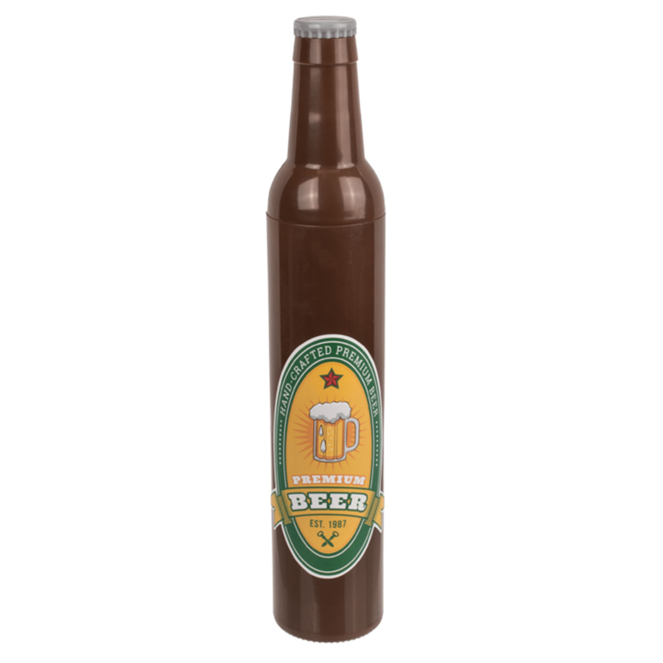 Der Regenschirm ist ein zuverlässiger Regenschutz und ein absoluter Hingucker. Der Schirm kommt mit einer verschraubbaren Kunststoff-Hülle in Form einer Bierflasche mit Emblem. Der Schirm mit Bierflaschen und Krügen als Motiv, kann ganz einfach ausgefahren und am Flaschenhals gehalten werden. Unter dem angedeuteten Kronkorken befindet sich eine fixierte Handschlaufe zum tragen.