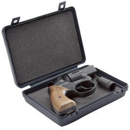 Der handliche Röhm RG 59 Schreckschuss-Revolver kommt im Kaliber 9mm R.K.. Brünierte Ausführung mit Griffschalen in Holzoptik.