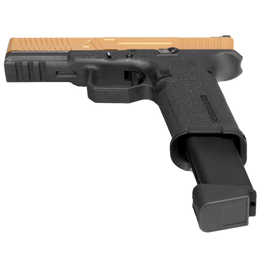 Wie bereits in der Einführung geschrieben setzt RWA auch beim Rahmen auf eine Lizenzversion. Hier kommt eine Airsoftvariante des TWF Timberwolf Rahmens von Lone Wolf Distribution aus Polymer-Verbundkunststoff zum Einsatz. Der amerikanische Hersteller ist seit 1998 am Markt und gehört mittlerweile zu einem der größten Hersteller für Reinforced und Upgrade Parts, wenn es um scharfe Glock Pistolen geht. Die Airsoftreplika des Rahmens unserer RWA EXA Pistole ist für einen hervorragenden Grip mit dem sogenannten Signature Shark Scale Faux Stippling versehen, welches im Bereich des Griffes sowie im oberen Rahmenbereich eingearbeitet ist. Die raue Struktur sieht nicht nur interessant aus, sondern sorgt auch dafür, dass sich die Pistole in jeder Situation sicher führen lässt. Im Gegensatz zu vergleichbaren Griffstücken anderer Hersteller, ist das Lone Wolf Modell mit einem geraderen Winkel und einem verlängerten Beavertail ausgestattet. Beide Eigenschaften zusammen ergeben einen ergonomischeren Halt, wodurch sich mit der Pistole sicherer Zielen lässt. Das Griffstück bietet wie auch beim scharfen Vorbild die Möglichkeit, den Griffrücken auszutauschen, um die Pistole besser an den Schützen anpassen zu können. Für den Wechsel sind zwei unterschiedliche Größen im Lieferumfang enthalten. Unterhalb des Griffes befindet sich ein praktischer Magazin-Well aus Aluminium. Dieser erleichtert und beschleunigt das Magazinnachladen, da er wie ein Trichter fungiert. Last but not least kann der Magazin-Löser wahlweise links oder rechts montiert werden. Bis auf den Verschlussfanghebel sind somit alle Bedienelemente auch von Linksschützen uneingeschränkt nutzbar.