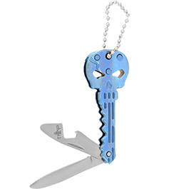 Der Skull Schlüsselanhänger kommt im Totenkopf-Design inklusive kleinem Messer und Flaschenöffner. Durch den rostfreien Edelstahl des Anhängers ist eine lange Haltbarkeit gewährleistet.