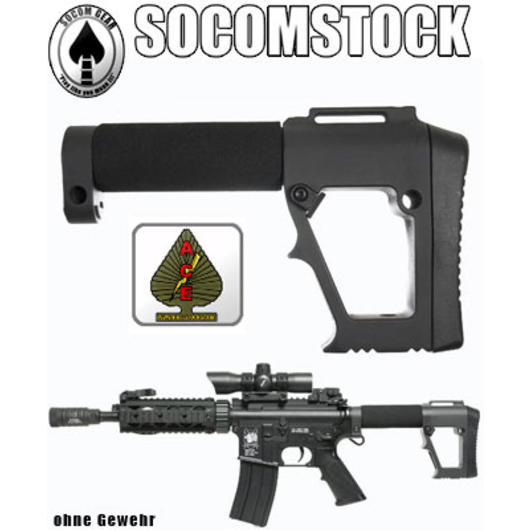 Von ACE lizensierter Socom Schaft von Socom Gear. Durch die ACE Lizenz entspricht der Schaft in den Abmaßen 1/1 dem Origial. Der Schaft ist universell passend bei allen M4 / M16 Gehäusen und kann 4-fach ausgezogen werden. Durch die vollmetall Bauweise hält der Schaft auch starken Belastung mühelos stand. Die gummierte Schaftkappe sowie die aus weichem Schaumstoff bestehende Wangenauflage tragen zum sehr guten Tragekomfort bei. Weiterhin besitzt der Schaft noch 5 Löcher um eine QD Riemenhalterung einsetzen zu können.