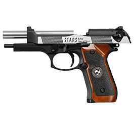 Das Schusssystem basiert auf dem Wei-ETech M9 bzw. M92F Gas-Blow-Back System. Dank der vielen Metallteile im Innern der Pistole ist dieses sehr zuverlässig und kann wahlweise auch mit CO2 Magazinen betrieben werden. Des Weiteren verfügt die Pistole über ein einstellbares Hop-Up System, um die Kugelflugbahn zu optimieren.
