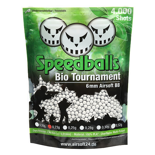Wir empfehlen die 0,23g Speedballs Bio Tournament BBs für alle Airsoftmodelle ab 1,0 Joule bis 1,3 Joule.