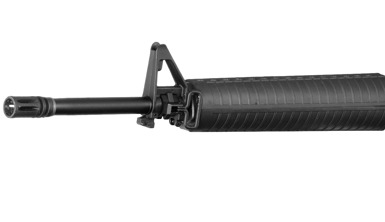 Die Vorderseite des Gewehrs ist mit einem einteiligen 20 Zoll Aluminiumaußenlauf versehen. Auf diesem ist ein Aluminium Flash-Hider im Standard Design mit 14 mm Linksgewinde montiert. Aus dem gleichen Material ist auch das Standard Frontvisier mit Bajonetthalter sowie die seitliche Tragegurthalterung. Das Visier kann auch originalgetreu in der Höhe verstellt werden. Der Handguard kommt im M16A2 bzw. M16A3 Rifle Design und ist, wie beim Original, aus Polymer-Verbundkunststoff hergestellt. Das komplette Frontsystem ist bei diesem Airsoftgewehr sehr stabil gefertigt und passgenau montiert. Auch die passende Beschichtung im schwarz-matten Farbton sorgt für einen hochwertigen Gesamteindruck.