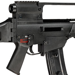 Wie nicht anders zu erwarten, ist natürlich auch das Hauptgehäuse bei diesem Gewehr aus hochwertigem und robustem Polymer-Verbundkunststoff hergestellt. Sehr interessant ist die authentische Struktur der Oberfläche. Diese Eigenschaft macht die SR36 GBB Gewehrserie sehr originalgetreu - im Vergleich zu vielen anderen Airsoftnachbauten. Wie es sich für einen 36E Gewehrnachbau gehört, befindet sich über dem Hauptgehäuse der Tragegriff mit integriertem Zielfernrohr. Das Scope ist mit einer 3-fachen Vergrößerung ausgestattet, wodurch mit dem Gewehr sehr gut gezielt werden kann. Natürlich kann das ZF auch seitlich und in der Höhe justiert werden. Oberhalb des Zielgerätes wurde eine ca. 90 mm lange 21 mm Schiene aus Aluminium angebracht. Diese dient für die Montage eines Leuchtpunktzielgerätes aus dem Zubehörmarkt. Der Magazin-Lösehebel, Spannhebel und der Feuerwahlhebel sind mittig bzw. beidseitig angebracht, wodurch das Gewehr auch sehr gut von Linksschützen benutzt werden kann. Das Griffstück kommt im Standard Design und ist mit detaillierten Piktogrammen versehen, die optisch gleich zum Originalgewehr sind.