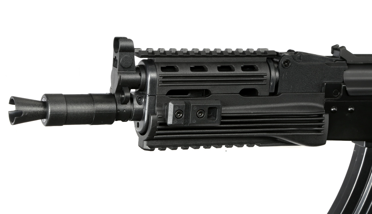 Das Frontsystem mit Außenlauf, Flash-Hider und Frontvisier ist bei diesem Gewehr komplett aus Polymer-Verbundkunststoff gefertigt. Das Material ist flexibel und sorgt gleichzeitig für eine sehr gute Stabilität. Der Handguard kommt hier im taktischen Design und ist mit vier 21mm Montageschienen ausgestattet. Diese erlauben das Anbringen von diversen Zubehörteilen. Wie der dahinterliegende Gehäuseblock ist auch der Handguard aus Verbundkunststoff gefertigt. Der Innenlauf ist bei diesem AK Gewehrnachbau aus Metall gefertigt und sorgt für eine gute Schusspräzision ab Werk.