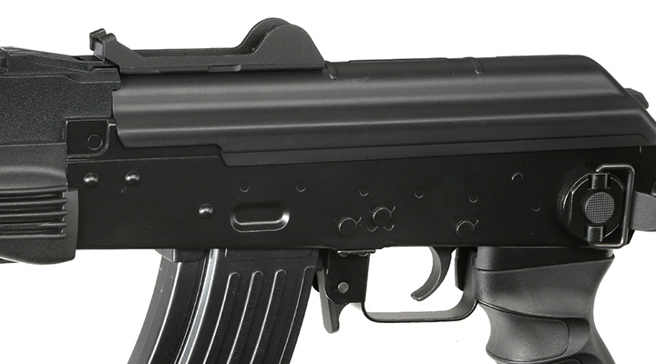 Auch das Hauptgehäuse ist bei diesem Modell aus robustem Verbundkunststoff hergestellt. Durch die Farbgebung und die leicht raue Oberflächenbeschaffenheit mit angedeuteten Pins besitzt das SRC Airsoftgewehr eine passende Optik. Die Abdeckung über dem Gehäuse ist wie beim Original, aus Stahlblech hergestellt und kann auch abgenommen werden. Darunter befindet sich bei diesem Gewehr das Akkufach. Für einen Wechsel des Akkus wird dadurch kein zusätzliches Werkzeug benötigt. Im Akkufach können 8.4V - 9.6V NiMH Stick-Type oder baugleiche 7.4V LiPo Akkus eingesetzt werden. Als Anschlussstecker ist der gängige Mini-TAM Stecker angebracht´. Die Visierung kommt aus Aluminium. Sämtliche Teile sind passgenau gefertigt und sitzen fest aufeinander. Im Vergleich zu chinesischen Nachbauten, ist hier dem Gewehr deutlich die Taiwan Fertigunsqualität anzumerken. Aber auch die anderen Teile des Gewehrs sind passend montiert und besitzen eine gute Verarbeitung. Auf der linken Seite des Gehäuses ist noch eine praktische Riemenhalterung integriert, während die andere Seite mit dem bekannten AK-Feuerwahlhebel ausgestattet ist. Der Griff im ergonomischen Design mit Fingermulden sorgt für einen sehr guten Halt und ist wie die Mehrheit der verwendeten Teile ebenfalls aus Verbundkunststoff hergestellt.