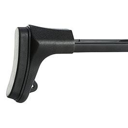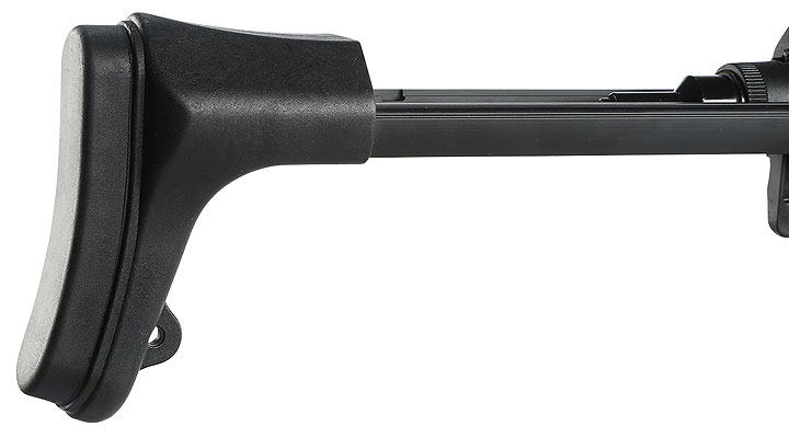 Authentisch, wie bei der echten MP in der A3 Variante ist hinten auch beim SRC Nachbau ein Schiebeschaft angebracht. Dieser läuft auf zwei Aluminiumstreben und ist an der Hinterseite mit einer gummierten Schaftkappe versehen. Der Schaft besitzt zwei Arretierungen und kann eingeschoben oder komplett ausgezogen werden.