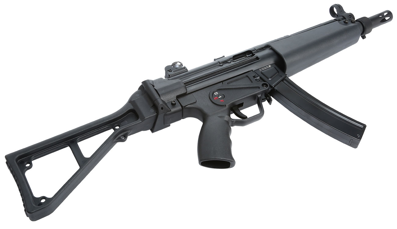 Diese Variante aus der SR5 Serie ist an der Hinterseite mit einem Verbundkunststoff-Klappschaft im UMP-Style ausgestattet. Der Schaft besitzt am Klappgelenk eine Tragegurthalterung und kann nach rechts eingeklappt werden.
