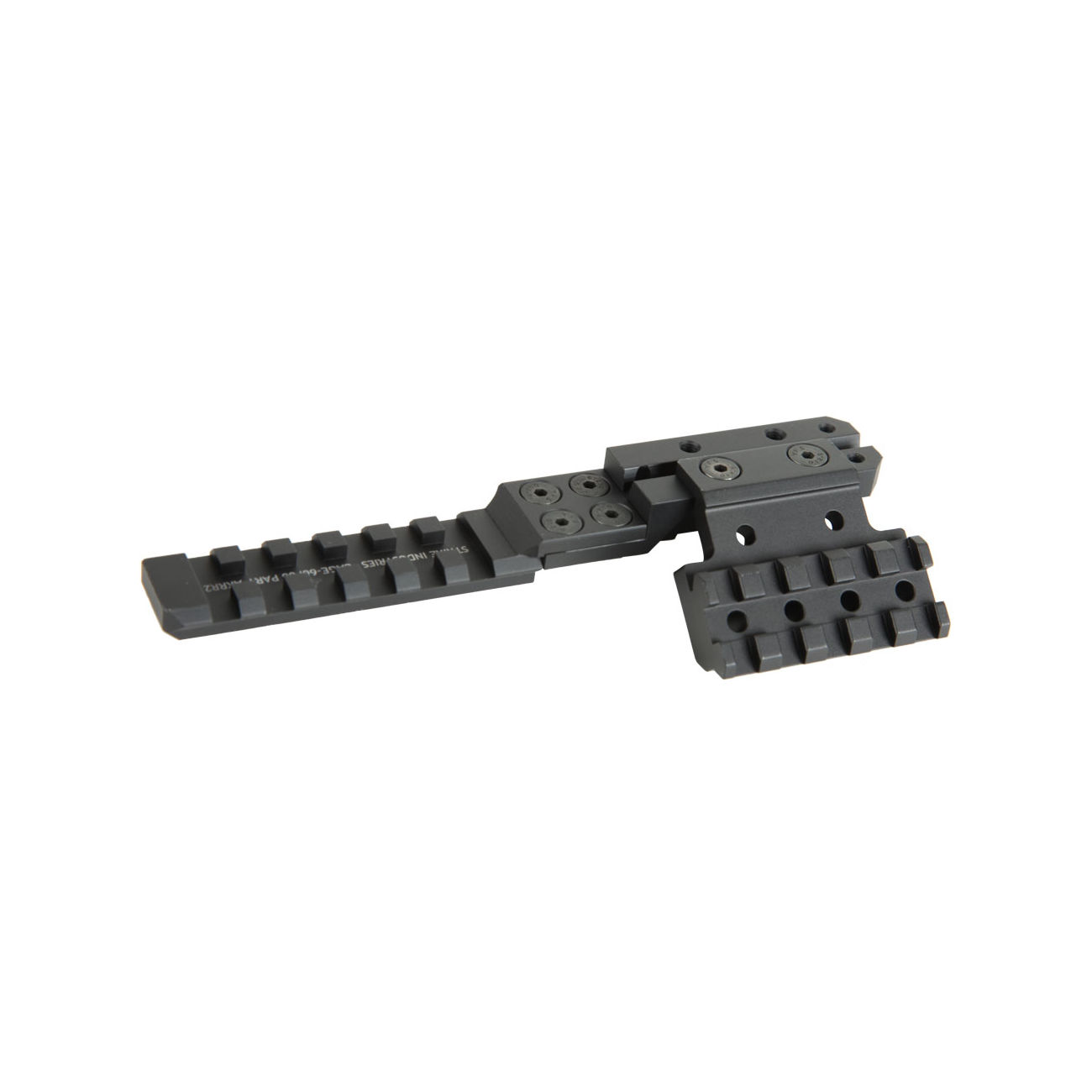 Zur Montage von Zielgeräten stehen zwei 21mm Schienen parat. Die vordere ist um 45 Grad abgewinkelt und kann links oder rechts montiert werden. Die hintere 21mm Schiene ist gerade und besitzt eine Länge von ca. 55 mm. Alle beiden Schienen können bei Nichtgebrauch einzeln mittels Innensechskantchrauben abmontiert werden.