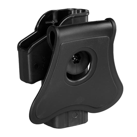 Weiterhin kann das Holster zudem einfach beliebig um 360 Grad gedreht und wieder fixiert werden. Dazu muss nur mit einem Innensechskantschlüssel (mitgeliefert) das Holster gelöst werden. Dieses geschieht durch eine Schraube, die durch die Öffnung des Arretierungsknopfes erreicht werden kann. Hierdruch kann das Holster auch an anderen zusätzlich verfügbaren Plattformen (separat erhältlich) angebracht werden.