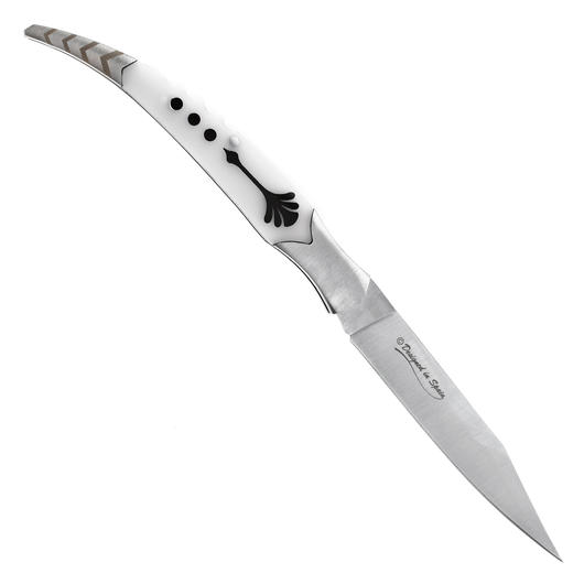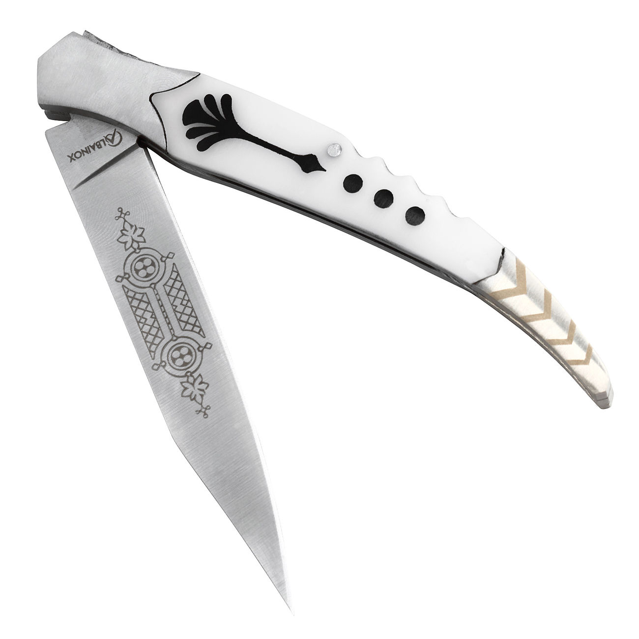 Elegant geformtes schmales Taschenmesser. Auf der Klinge wurde einseititg über Laser eine dekorative Verziehrung angebracht. Die Klinge besteht aus rostfreiem Stahl und hat eine Länge von 88 mm.
