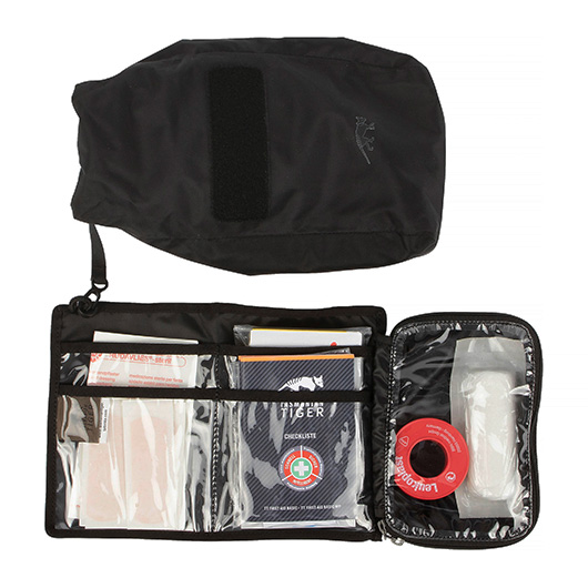 Der wasserdichte Rollverschluss, getapte Nähte und das T-Cover Tex Material sorgen dafür, das auch bei Regen das Verbandszeug nicht nass wird. Die Klettfläche an der Vorderseite ermöglicht das Anbringen von Patches, Abzeichen oder Namensstreifen, um die Tasche beispielsweise auch nach außen hin als Erste-Hilfe-Tasche kenntlich zu machen. Ein Medic Klettpatch ist im Lieferumfang bereits enthalten.