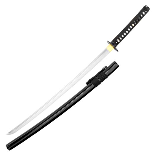 Das Black Swan Katana von Tole 10 Imperial ist ein echter Blickfang. Es kommt mit einer Klinge aus Öl gehärtetem Kohlenstoffstahl, die zusätzlich über einen Wellenschliff und eine Hohlkehle verfügt. Der Griff ist mit einer weißen, Rochenhaut-Nachahmung bedeckt und verfügt über eine traditionelle Hineri Maki Wicklung aus schwarzer Baumwolle.
