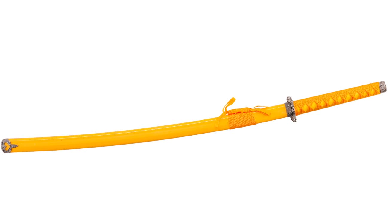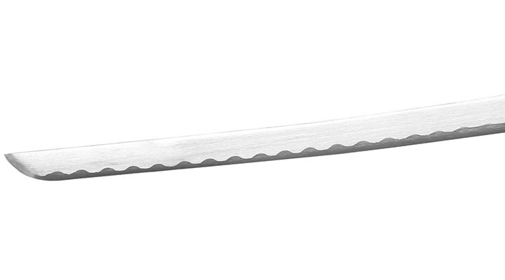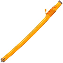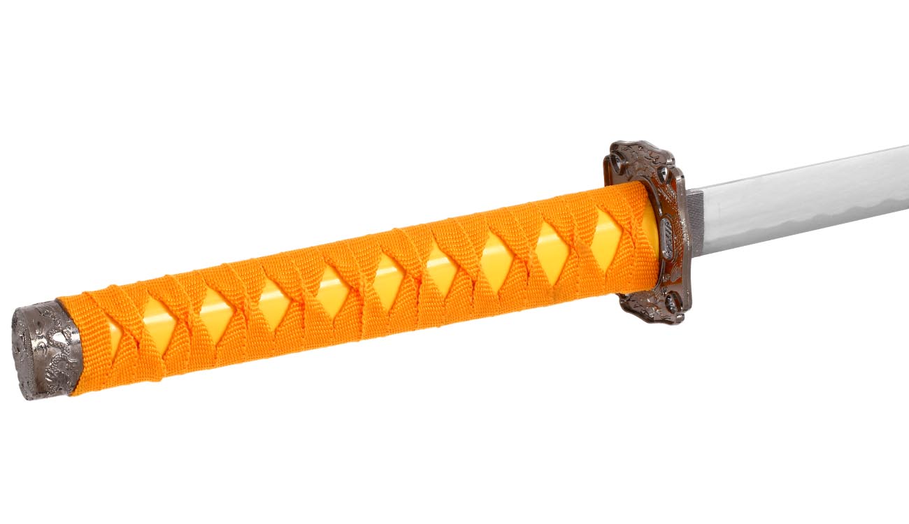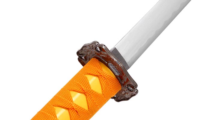 Das Tole 10 Imperial Katana kommt mit einer Klinge aus Kohlenstoffstahl und mit Wellenschliff. Der ABS Kunststoffgriff verfügt über eine traditionelle Hineri Maki Wicklung aus orangefarbenen Nylon. Die Tsuba bei diesem Katana besteht aus stabilen Metall und ist mit einem Drachenmuster verziert.