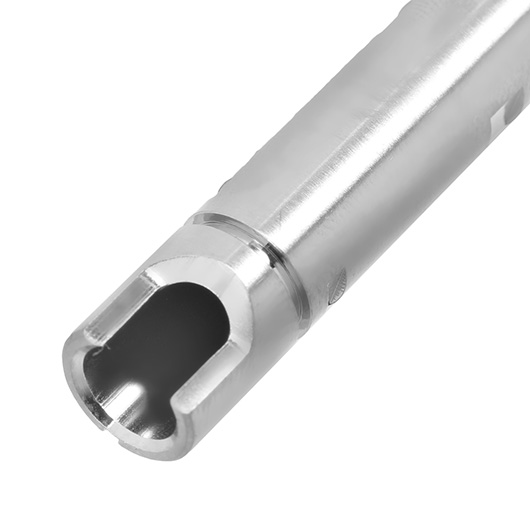 Das verwendete Edelstahl-Material ist durch die starke Materialstärke besonders stabil, wodurch sich Läufe aus diesem Material nicht so einfach verbiegen können. Auch ein Anlaufen / Beschlagen wird im Innern verhindert. Damit die Reibung noch weiter reduziert wird, setzt TTI Airsoft auf ein spezielles Polierverfahren. Diese Eigenschaft sorgt für eine perfekte Leistungsabgabe auch bei kälteren Temperaturen und eine besonders stark spiegelnde Innenfläche. An der Vorderseite ist der Lauf trichterförmig gefräst, damit das Antriebsgas besser entweichen kann und die verschossene 6mm BB nicht im Flug beeinträchtigt wird.