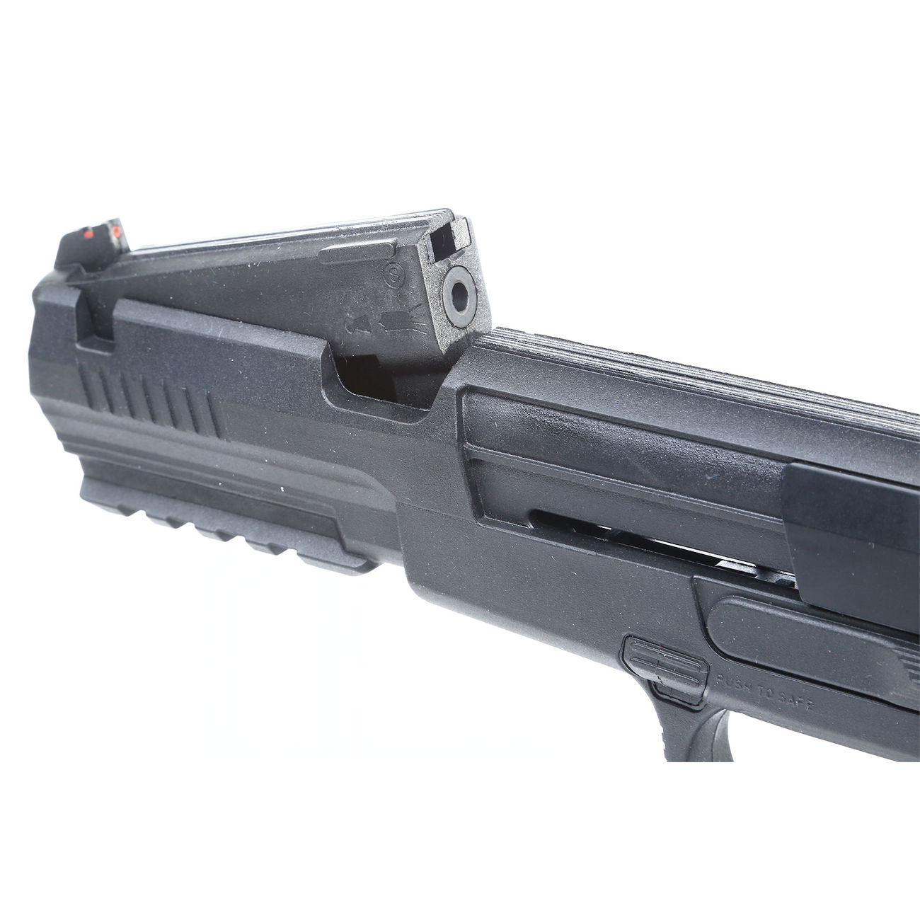 Für das Anvisieren des Ziels besitzt die Luftpistole DX 17 von Umarex Kimme und Korn. Eine Picatinny Schiene unter dem Lauf ermöglicht das Anbringen von verschiedenen Zubehörteilen.