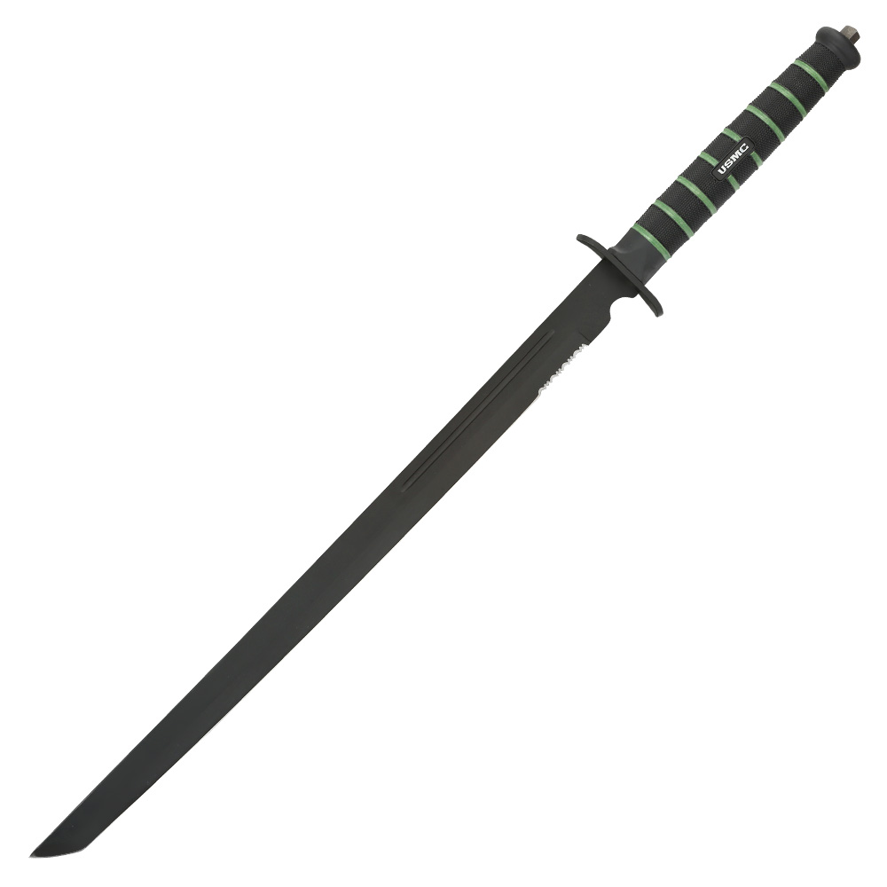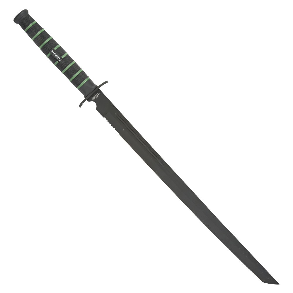 Das Blackout Combat Tanto von United Cutlery kommt im Style des USMC Kampfmessers. Die schwarz beschichtete Klinge aus rostfreiem AUS-6 Stahl besitzt eine scharfe Teilsägezahnung. Die vorhandene Hohlkehle bietet zudem Stabilität und erspart Gewicht.