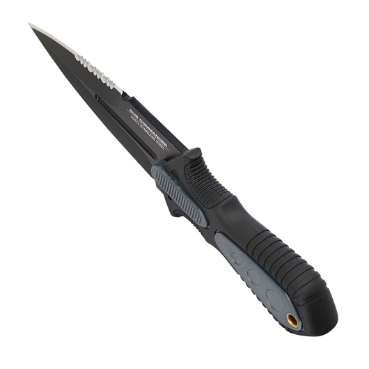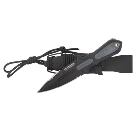 Das United Cutlery Combat Commander Stiefelmesser besitzt eine zweischneidige Klinge mit zusätzlicher Sägezahnung aus rostfreiem 3Cr13 Stahl. Der TPR-Gummigriff mit ABS-Kunststoffeinlagen ist rutschfest, gut strukturiert und besitzt eine Öse für einen Fangriemen.