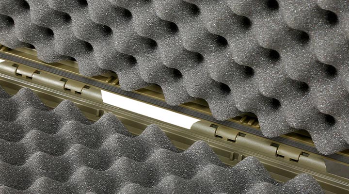 Für eine sichere Polsterung der eingelegten Gegenstände setzt SRC bei diesem Koffer komplett auf Inlays im Waben- bzw. Noppenschaumstoff Design. Diese bieten den Vorteil, dass kein Ausschneiden oder Zuschneiden notwendig ist. Die Gegenstände können somit einfach in den Koffer eingelegt bzw. platziert werden. Ein feines Detail ist auch die umlaufende Dichtung, die das Innenleben vor Staub und Regenwasser schützt.