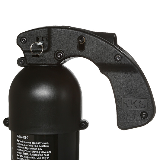 Der Sprühkopf in Pistolengriffform liegt gut und sicher in der Hand. Ein patentierter Sicherheitsmechanismus verhindert den Gebrauch der Sprühdose nach gewaltsamen entreißen. Eine Sprühkopfabsicherung verhindert Fehlauslösungen.