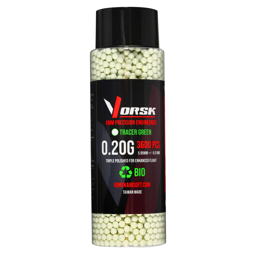 Die Tracer BBs von Vorsk Airsoft sind sehr leuchtstarke 6mm BB Tracer-Rundkugeln. Ähnlich wie bei "Glow-in-the-Dark" Sticker laden sich die Tracer-Rundkugeln mit hellem Licht auf und leuchten so bei Kugelaustritt eine ganze Zeit weiter. Neben den Kugeln wird für eine starke Leuchtkraft auch noch eine Tracer-Einheit zum anleuchten der Kugeln benötigt (siehe Zubehör). Vor allem in der Dämmerung oder Nacht entfallten die Tracer-Kugeln ihr wahres Potential und sorgen für eine geniale Leuchtspur-Action!