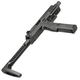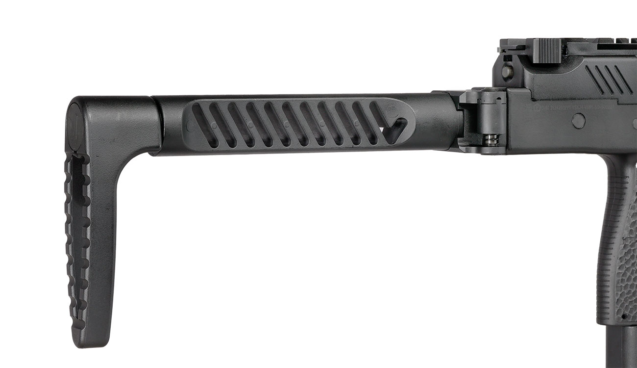Der Schaft beim VMP-1 wird durch ein stabiles Aluminium-Scharnier mit Arretierungsfeder sicher in Position gehalten. Je nach Belieben kann der Schaft seitlich nach rechts eingeklappt oder ausgeklappt werden. Das Schaftgestänge kommt, wie auch das Gehäuse des SMGs, aus Polymer-Verbundkunststoff. Die schrägen Öffnungen passen optisch perfekt zum Gehäusedesign. Besonders interessant ist die rutschhemmend strukturierte Schaftkappe. Diese ist federgelagert und kann um 15° nach links und rechts in der Neigung verstellt werden. Ein Feature, das für noch mehr Präzision beim Schießen um Ecken sorgt. Gefällt der Schaft nicht, kann auch eine Standard M4 Stock-Tube aus dem Zubehörmarkt am VMP-1 Receiver montiert werden. Im Anschluss kann dann ein Schaft aus dem M4 Sortiment mit dem Vorsk VMP-1 kombiniert werden. So lässt sich das SMG sehr gut an den Schützen anpassen.