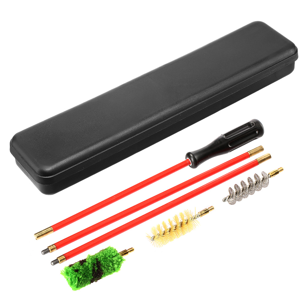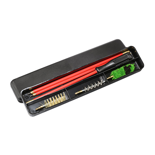 Waffenputzset mit kunststoffüberzogenen Putzstock im Kaliber .16. Das Set beinhaltet eine Spiralbürste zum Entfernen von hartnäckigen Verschmutzungen, eine Borstenbürste für mittlere Verschmutzungen und eine Wollbürste zum Auftragen von Waffenöl. Zusätzlich gehören eine Kunststoffbox und zwei Stabverlängerungen mit Schraubgewinde zum Lieferumfang.