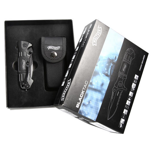 Die wuchtige, mattschwarze Klinge aus 440er Stahl ist scharf geschliffen und mit partiellem Wellenschliff ausgestattet. Der Flipper, der auch ein leichteres Öffnen des Messers ermöglicht, dient im geöffneten Zustand ebenso als Parierelement und sorgt für einen sicheren Griff. Das Walther Einhandmesser verfügt zusätzlich über eine Fangriemenöse und einen Glasbrecher.