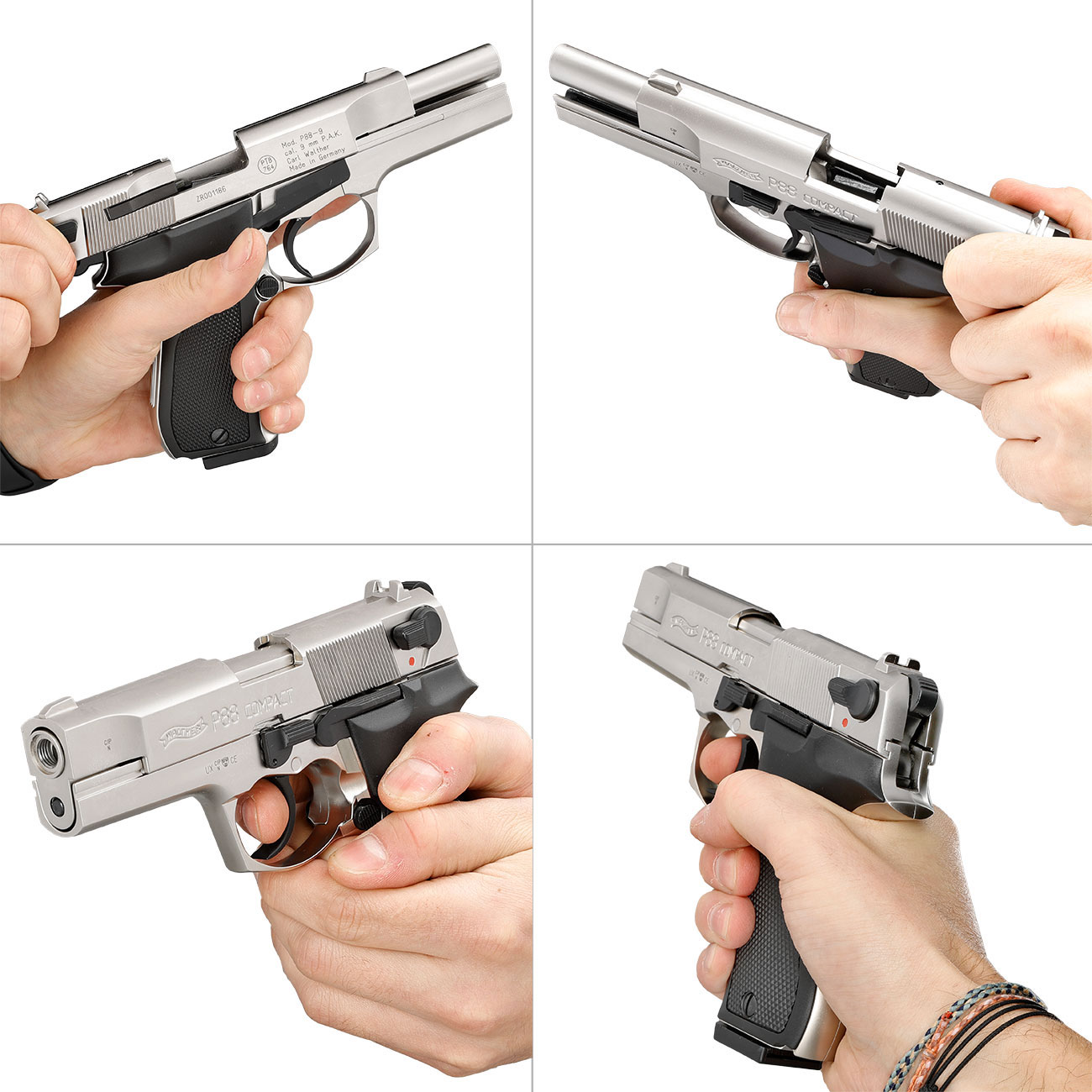 Die Konstruktion ist äußerst robust, so dass sie stärksten Belastungen standhält. Mit den schwarzen Griffschalen aus stabilem Kunststoff liegt die P88 sehr angenehm in der Hand. Die Funktion und die technischen Details der Gas-Signal-Version entsprechen dem Original bis hin zum Walther Schriftzug.