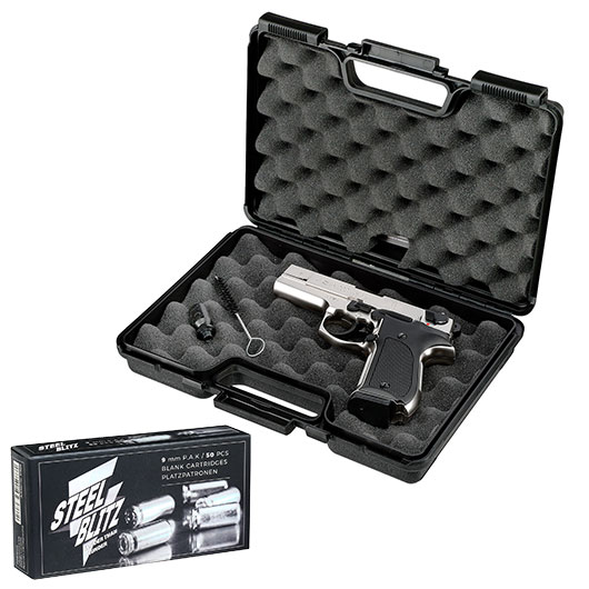 Im Set dabei sind 50 Schuss Steel Blitz Platzpatronen der Marke Pobjeda. Die Platzpatronen sind zur Selbstverteidigung und auch zum Verschießen von Feuerwerksmunition/Signalsternen verwendbar.