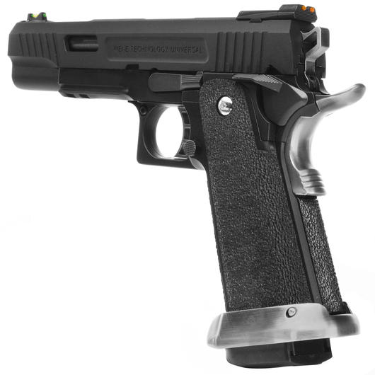 Dank dem Griffstück im Custom Design, dass zusammen mit dem Trigger Guard aus einem Teil besteht, liegt die Pistole sehr gut in der Hand. Selbst bei nassen Wetterverhältnissen sorgt der Griff für einen sicheren Halt. An der Unterseite des Griffes ist ein großer Aluminium Magazin-Well angebracht. Dieser erleichtert und beschleunigt das Magazinnachladen, da er wie ein Magazinführung fungiert. Desweiteren verfügt die Pistole über ein einstellbares Hop-Up System, um die Kugelflugbahn zu optimieren.
