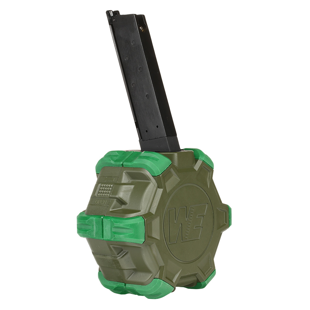 Das von Wei-ETech hergestellte Trommelmagazin ist überwiegend aus stabilem Aluminium und Polymer-Verbundkunststoff gefertigt und bringt ca. 1.060 g auf die Waage. In dieser Ausführung ist das Magazin passend für die Wei-ETech M1911 / MEU Pistolenserie bzw. Pistolen mit Wei-ETech kompatiblen M1911 Magazinschacht und Gas-Blow-Back Schusssystem.