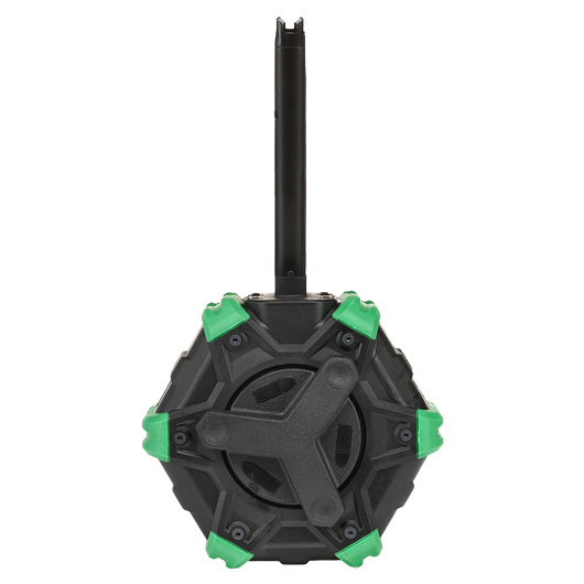 Die um die Trommel eingesetzten grünen Gummieinsätze schützen das Magazin vor stößen oder beim herunterfallen. Wahlweise können die Einsätze auch entfernt werden. Hierzu muss nur die Vorderseite des Trommelmagazins durch das Lösen der sechs vorderen und zwei oberen Innensechskantschrauben abgenommen werden. Die Gummieinsätze können dann herausgeschoben werden.
