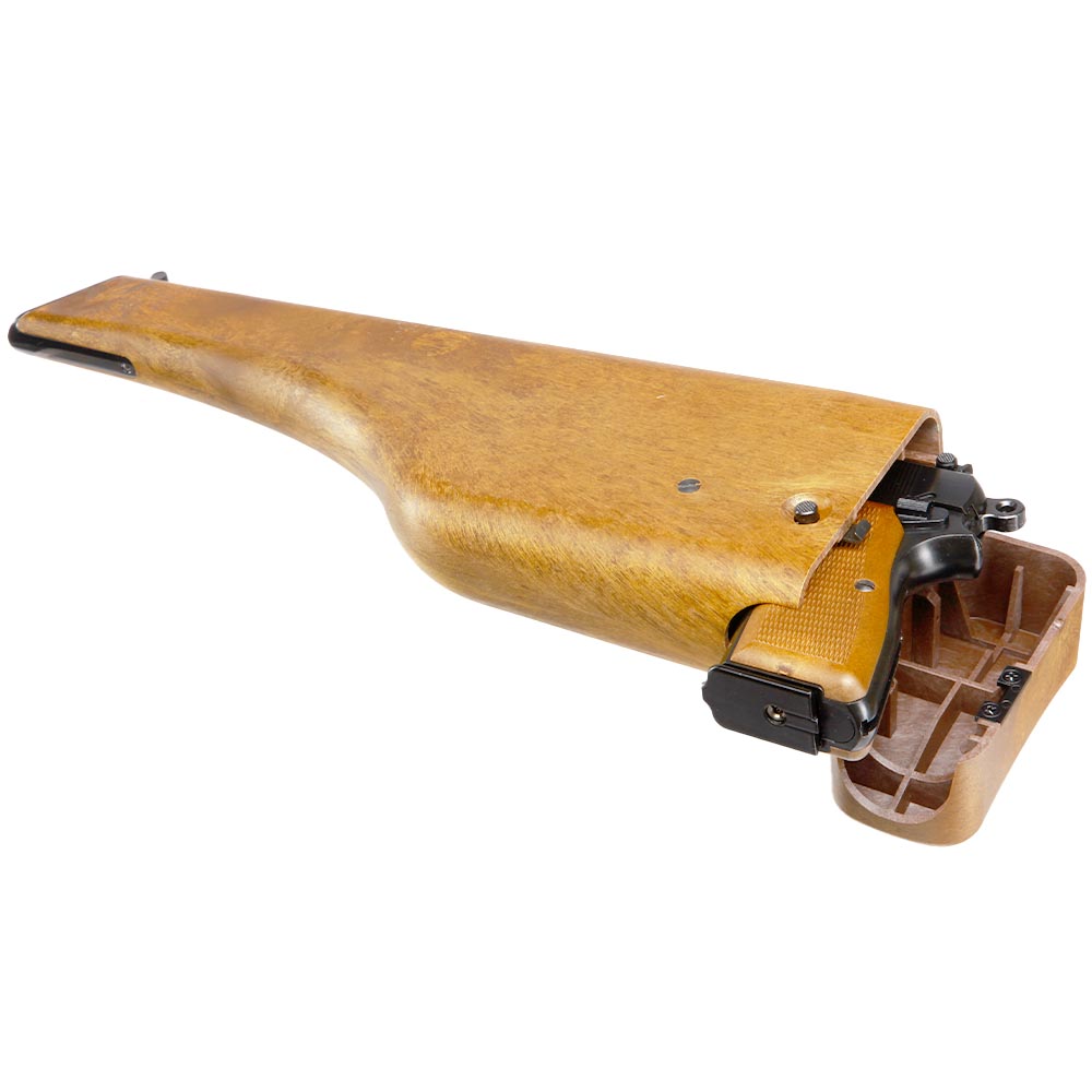 Ein besonderes Highlight des Wei-ETech Airsoftnachbaus ist die enthaltene Reproduktion des Futterals. Hergestellt aus Verbundkunststoff, ist es wie die Griffschalen sehr gut eingefärbt und besitzt ein sehr schönes Holzdesign. Neben der Funktion als herkömmliches Futteral kann das "Futteral", wie beim Original auch als Anschlagschaft verwendet werden (siehe Produktfotos). Durch einen Schnellverschluss kann der Schaft innerhalb weniger Sekunden angebracht oder abgenommen werden.