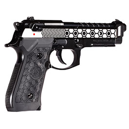 Die Hex Cut Version der M9A1 Gas-Blow-Back Pistole gehört mit zu den außergewöhnlichen Pistolen aus dem Wei-ETech Sortiment. Vor allem Airsoft-Enthusiasten, die eine besondere Pistole suchen, sind bei der Hex Cut Variante genau bei der richtigen Adresse. Für Aufsehen sorgen hier die sauber eingearbeiteten Muster im extravaganten Hex Cut Design - ein Stilelement, das die M9A1 Pistole wie ein Heavy Metal Designobjekt wirken lässt!