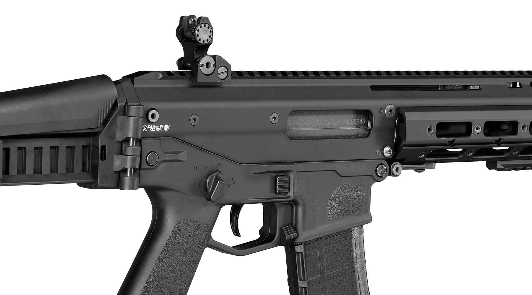 Auch der Schaft ist bei diesem Nachbau sehr interessant und mehrfach verstellbar. Dieser kann nicht nur, wie bei der Standard Version, seitlich eingeklappt sondern auch in der Länge verstellt werden. Insgesamt stehen 7 ausziehbare Stufen zur Verfügung um das Gewehr an den Schützen anpassen zu können. An der Hinterseite ist weiterhin eine geriffelte Gummischaftkappe angebracht, die für einen guten Halt im Anschlag sorgt. Weiterhin verstellbar ist auch die Wangenauflage. Die besitzt 2 Positionen für ein perfektes Anpassen. Die gesamte Schaftkonstruktion ist aus hochwertigem Verbundkunststoff hergestellt und passgenau gefertigt. Um einen Tragegurt montieren zu können ist beidseitig eine Öffnung für die im Lieferumfang enthaltene QD-Tragegurthalterung enthalten.