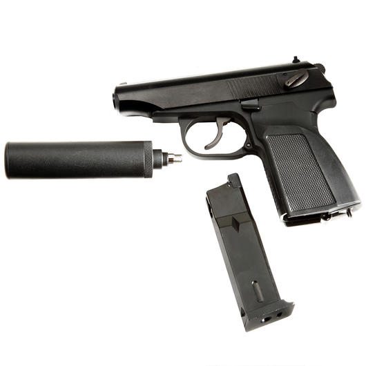Maßstabsgetreuer Vollmetall Airsoftnachbau der weltbekannten russischen Pistole. Es handelt sich hierbei um die modernisierte Ausführung der PM, genannt PMM, wie sie seit den 90iger Jahren gebaut wird. Seit 2015 gehört die PMM neben einer weiteren Pistole zur offiziellen Dienstpistole der russischen Fallschirmjäger. Die Wei-ETech Nachfertigung kommt mit halbautomatischen Gas-Blow-Back System und besitzt eine komplette Metallrahmenkonstruktion mit Metallschlitten wodurch auch das passende Gewicht von ca. 735 g (ohne Silencer) zustande kommt.