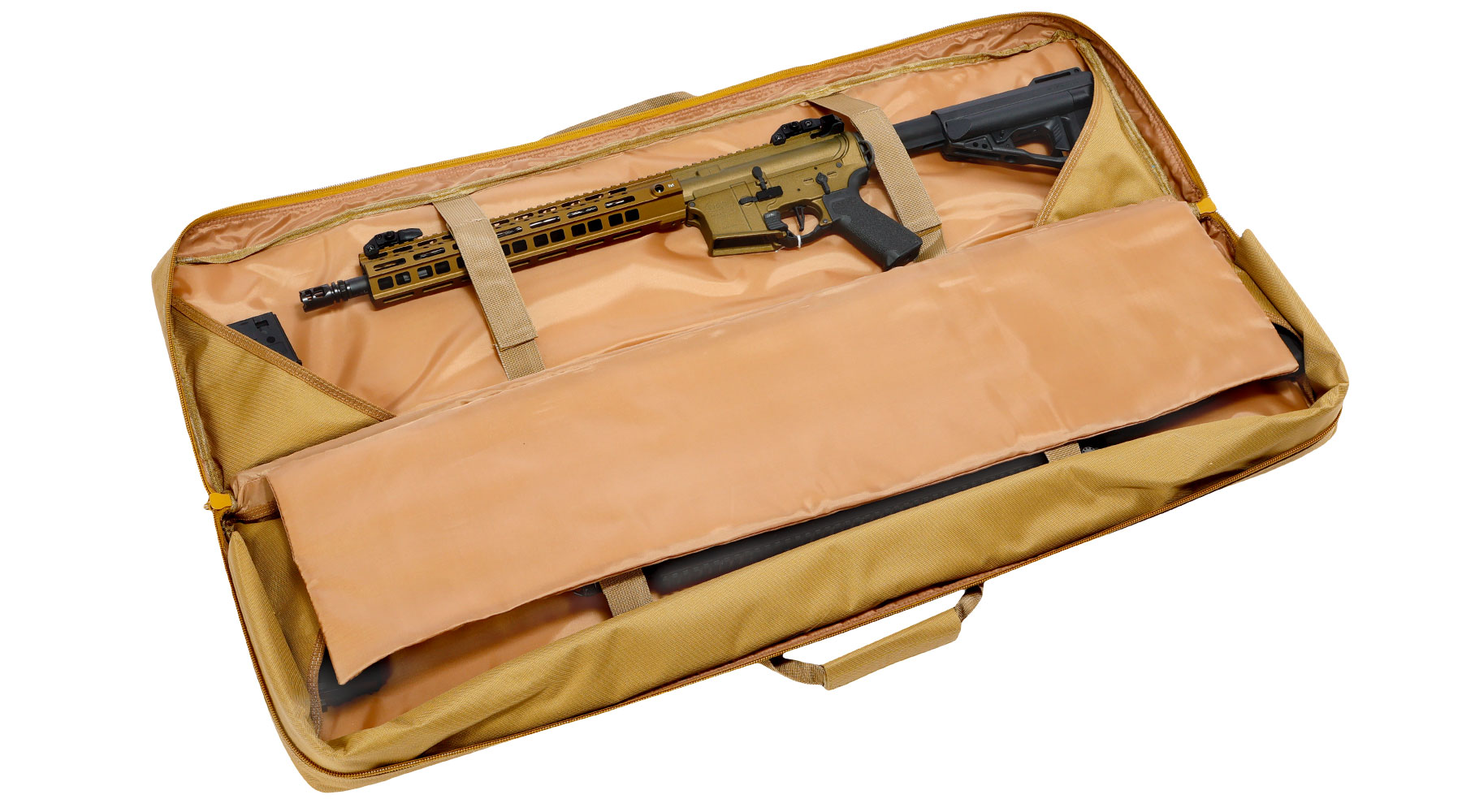 Das Futteral ist aus strapazierfähigem 600D-Polyester hergestellt und in zwei Fächer aufgeteilt. Das großzügig dimensionierte Hauptfach ist an den Innenseiten sowie am Rand weich gepolstert und bietet Platz für zwei Gewehre mit einer Länge von bis zu jeweils 100 cm. Eine gepolsterte Trennfläche sorgt für eine sichere Trennung der beiden Gewehre und verhindert Kratzer oder Beschädigungen. Für eine sichere Fixierung der Gewehre während des Transports sorgen Klettflächen und Einschübe. Das Hauptfach wird über zwei starke Reißverschlüsse geschlossen, die wahlweise zusätzlich mit einem kleinen Kofferschloss gesichert werden können (Schloss nicht enthalten).