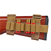 Der praktische Gewehrschaft-Patronenhalter bzw. -Patronenetui ermöglicht das Mitführen von bis zu sieben Patronen direkt am Hinterschaft der jeweiligen Shotgun. Die Befestigung des Halters erfolgt mittels flexibler Nylongurte mit Klettverschluss am Schaft. Aufgrund der Längenverstellbarkeit der Gurte ist eine Montage an einer Vielzahl von Shot- und Pumpguns unterschiedlicher Hersteller möglich. Die Kapazität der Halterung umfasst bis zu sieben Shotgun-Patronen, wobei hierfür sieben dehnbare Gummischlaufen zur Verfügung stehen.