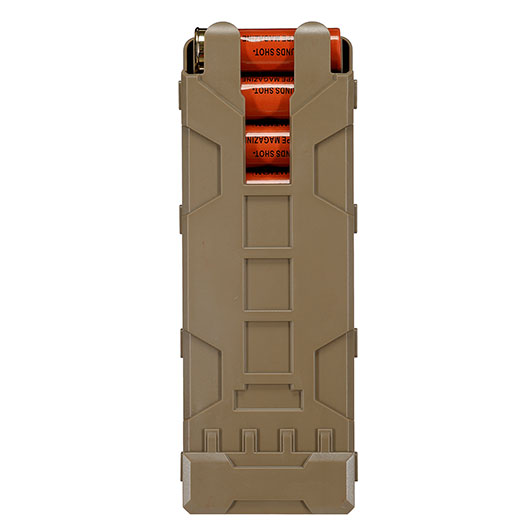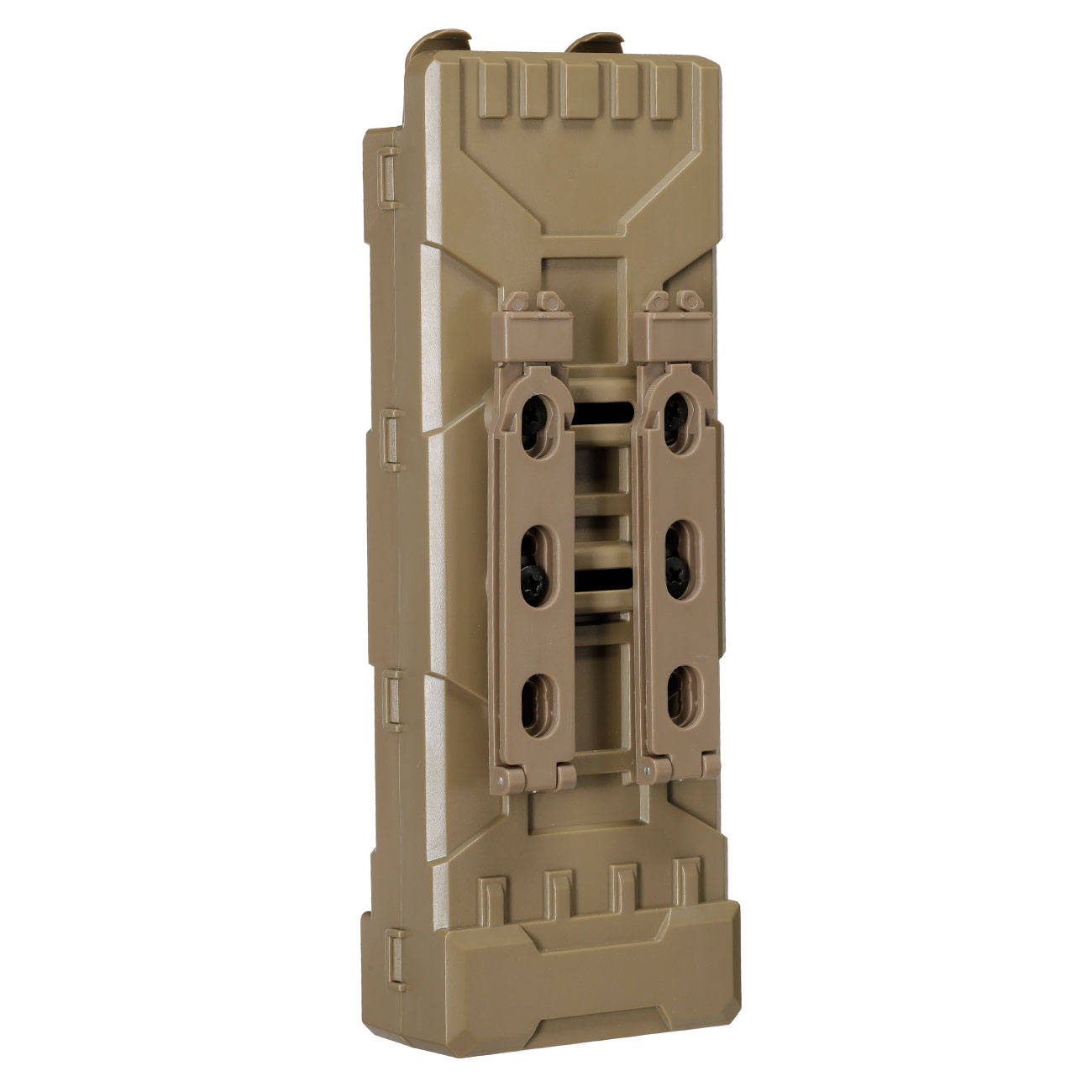 Gefertigt ist die Shotgun Patronen Tasche von WoSport aus robustem Verbundkunststoffmaterial. Die Hinterseite ist mit zwei Schlaufen für Molle Platformen bestückt, wodurch die Tasche universell anbringbar ist. Selbst an Gürteln kann die Tasche dadurch mühelos befestigt werden. Innerhalb der Pouch befindet sich ein Federzug, der die Patronen immer sicher nachführt. Ein wirklich praktisches Tool für Airsoft-Shotgun-Schützen.