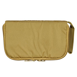 Die Pistolentasche ist aus stabilem 1000D Polyester hergestellt und wird an der Außenseite über einen stabilen doppelten Reißverschluss geöffnet bzw. geschlossen. Um den Inhalt zu schützen sind die beiden äußeren Seiten mit eingearbeitetem Schaumstoffplatten versehen. Gleichzeitig ensteht dadurch eine weiche Polsterung. Im Innern befinden sich zwei Klettbändern zur Befestigung der Pistole und einem Nylonzug für ein Ersatzmagazin.