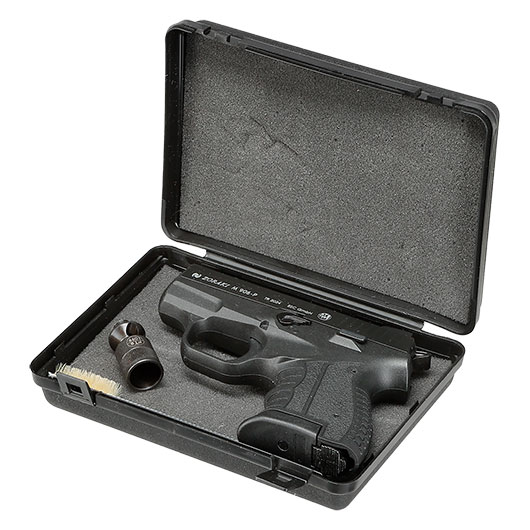 Die Schreckschusspistole 906 wird zusammen mit einem Abschussbecher und einer Reinigungsbürste in einem schaumstoff-gepolsterten Waffenkoffer geliefert.